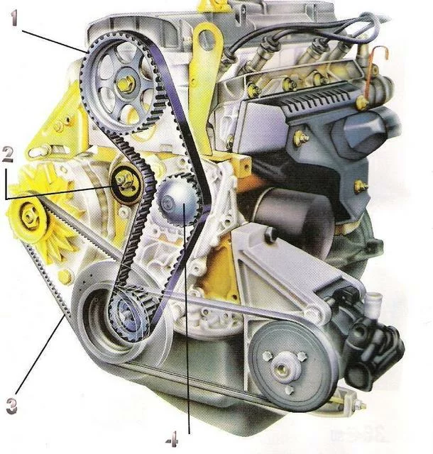1 : la courroie de distribution au niveau de l'arbre à cames